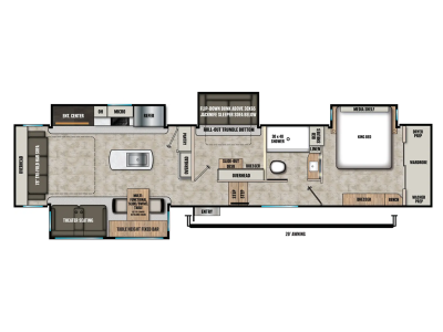 Spend your days at the lake and your evenings relaxing in this fifth wheel with four slide outs for tons of space. Your guests can claim the middle den to themselves that includes a jacknife sleeper sofa, a flip-down bunk above, and a dresser for their things. The chef of your crew will appreciate the kitchen island for extra counter space, and there are stainless steel appliances for added luxury. After dinner is cleaned up, relax on the theatre seating or on the rear tri-fold hide-a-bed sofa, or you may just want to be outside with the power to enjoy the evening air. This model also includes a front private bedroom with a king bed slide out, a dresser, plus a large wardrobe with washer and dryer prep. You may just decide to go full-time in this fifth wheel!