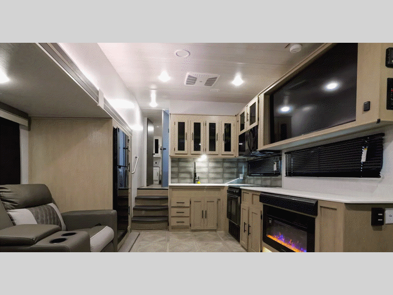 Sleeps 4 Slides 1 Length 32 ft Ext Width 8 ft 6 in Ext Height 13 ft 2 in Hitch Weight 1414 lbs Dry Weight 9022 lbs Cargo Capacity 2592 lbs Fresh Water Capacity 50 gals Grey Water Capacity 65 gals Black Water Capacity 40 gals Available Beds Custom King with Versa-Tilt Refrigerator Type 12V Refrigerator Size 10 cu ft Convection Cooking Yes Cooktop Burners 3 Number of Awnings 1 LP Tank Capacity 30 lbs Water Heater Type Tankless AC BTU 15000 btu TV Info LR 55" Smart TV Awning Info Power w/Adjustable Legs Axle Count 2 Number of LP Tanks 2 Shower Type Radius Electrical Service 50 amp Similar Floorplans