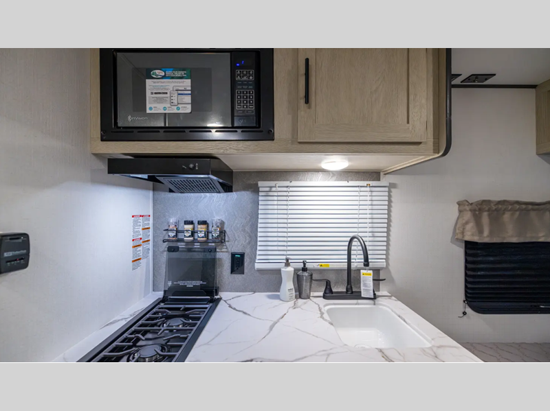 Sleeps 3 Length 23 ft 1 in Ext Width 8 ft Ext Height 10 ft 10 in Hitch Weight 532 lbs GVWR 4932 lbs Dry Weight 3787 lbs Cargo Capacity 1145 lbs Fresh Water Capacity 39 gals Grey Water Capacity 30 gals Black Water Capacity 30 gals Available Beds Queen Refrigerator Type Residential Style Refrigerator Size 8 cu ft Cooktop Burners 2 LP Tank Capacity 20 lbs Water Heater Type Tankless AC BTU 8000 btu Axle Count 1 Number of LP Tanks 1 Shower Type Standard Similar Floorplans